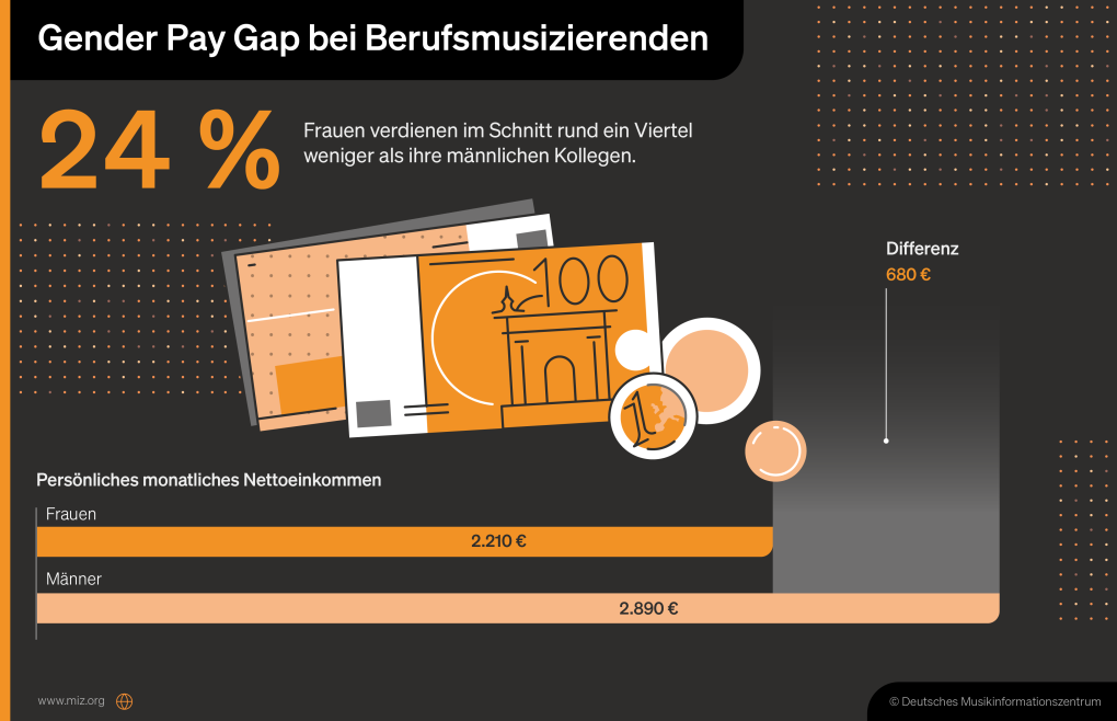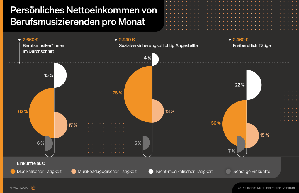 Das monatliche Nettoeinkommen der Berufsmusiker*innen in Deutschland liegt im Schnitt bei 2.660 Euro, allerdings verdient jede*r Fünfte weniger als 1.500 Euro pro Monat. Der mit Abstand größte Anteil der Einnahmen von Berufsmusizierenden stammt aus musikalischen Tätigkeiten: 62 Prozent aller Einkünfte erzielen Berufsmusizierende, indem sie professionell Musik machen. Dazu gehören neben Gehältern und Honoraren auch Einkünfte aus Studioaufnahmen, künstlerischen Projekten, Tonträgerverkäufen, Merchandising oder Ausschüttungen von Verwertungsgesellschaften. 17 Prozent der Einkünfte stammen zusätzlich aus musikpädagogischen Tätigkeiten und 15 Prozent aus beruflichen Tätigkeiten, die nichts mit Musik zu tun haben.
