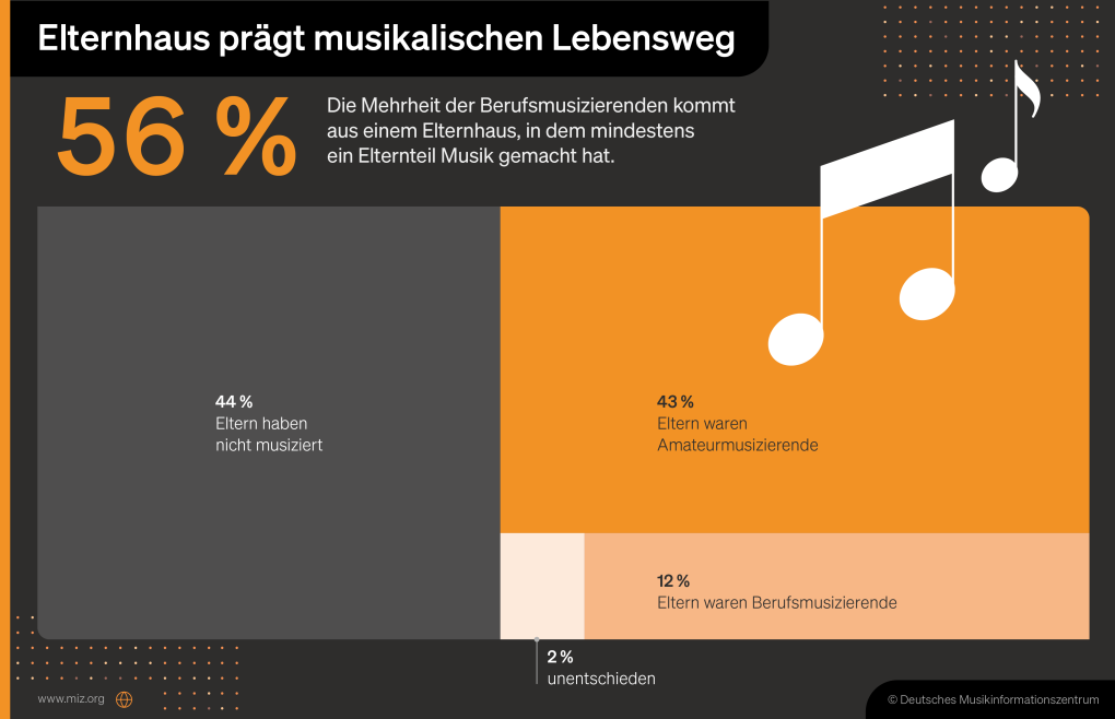 Zu diesem Ergebnis kommt eine neue repräsentative Erhebung des Deutschen Musikinformationszentrums (miz) in Kooperation mit dem Institut für Demoskopie Allensbach (IfD). Die Untersuchung wurde im November und Dezember 2022 bundesweit und genreübergreifend durchgeführt; sie stützt sich auf rund 650 mündlich-persönliche Interviews.