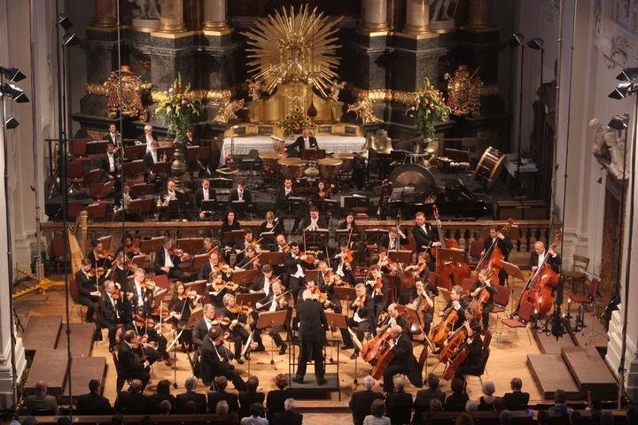 Über 20 Veranstaltungsorte gehören zu den Festspielen: Auf dem Foto ist der Dirigent Enoch zu Guttenberg mit den Hofer Symphonikern, dem Männerchor der Chorgemeinschaft Neubeuern und dem Bass Yorck Felix Speer in der Passauer Studienkirche zu sehen.
