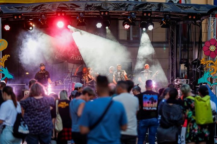 Große Bühne abends, mit Band darauf und Menschenmenge davor. Scheinwerfen leuchten durch den Nebel