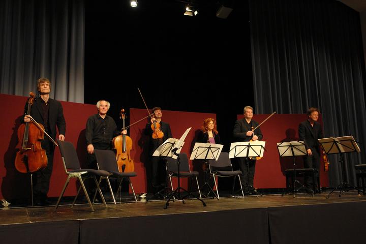 Tatjana Masurenko, Gustav Rivinius und das Vogler Quartett beim Eröffnungskonzert 2013 im Kulturzentrum Saalbau Homburg