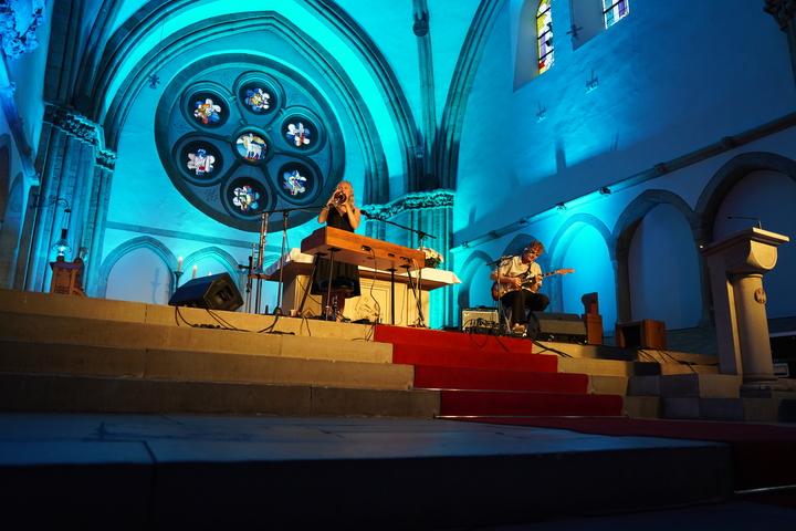 Musiker:innen (CATT) beim Kirchenkonzert mit bunt beleuchtetem Kirchraum