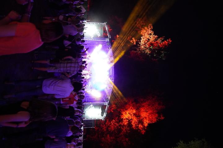 Blick auf die Hauptbühne mit Menschenmenge und bunt beleuchteten Bäumen