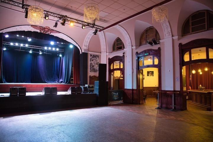Innenansicht Saal, mit Blick auf Bühne und Gastraum im Anbau