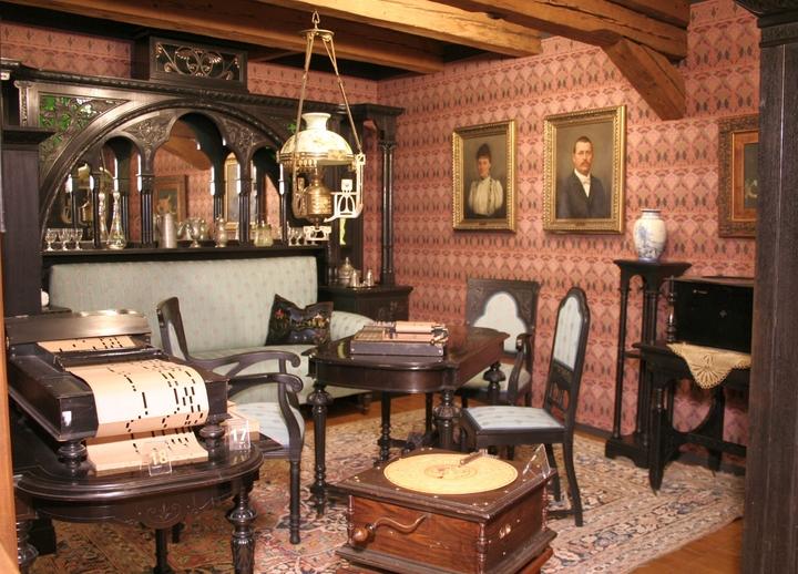 Präsentation von 27 mechanischen Musikinstrumenten im Ambiente ihrer Entstehungszeit, Vermittlung eines Einblicks in die Wohnkultur des 19. und 20. Jhs., Ausstellung von Drehorgeln, Spieldosen, Polyphonen, Orchestrien, einer Flötenuhr und selbstspielenden Flügeln.