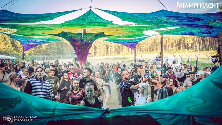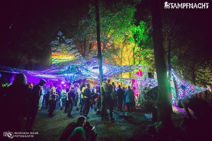 Stampfnacht Open Air Psyfloor bei Nacht mit bunter Dekoration und Lichtillumination