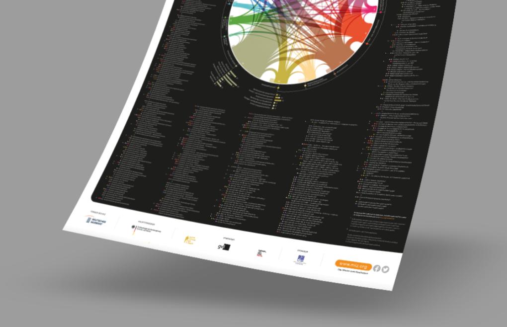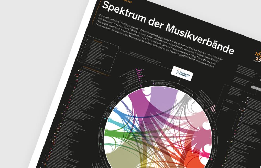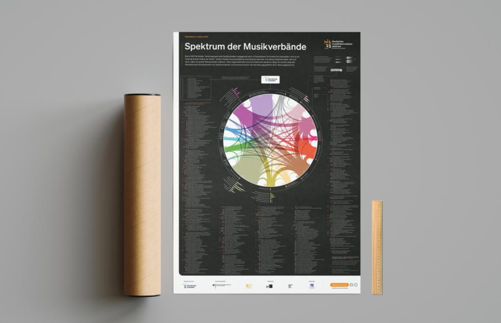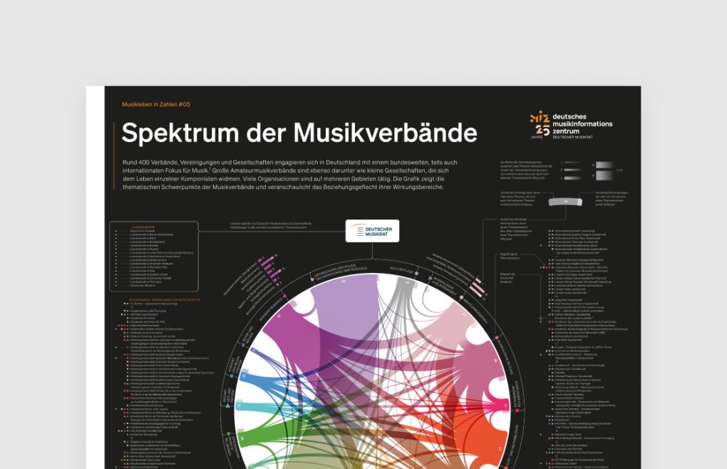 Das Infografikposter „Spektrum der Musikverbände“ stellt die Organisationen im Überblick vor und zeigt, in welchen Themenbereichen sie tätig sind. Die Daten basieren auf der Institutionendatenbank des Deutschen Musikinformationszentrums.
