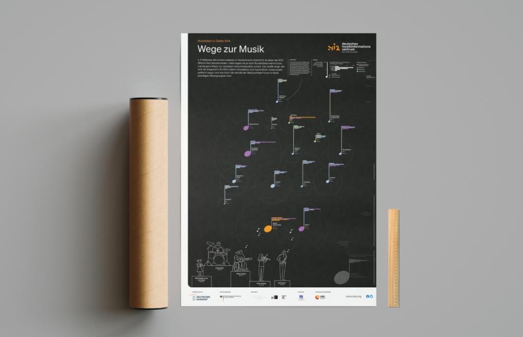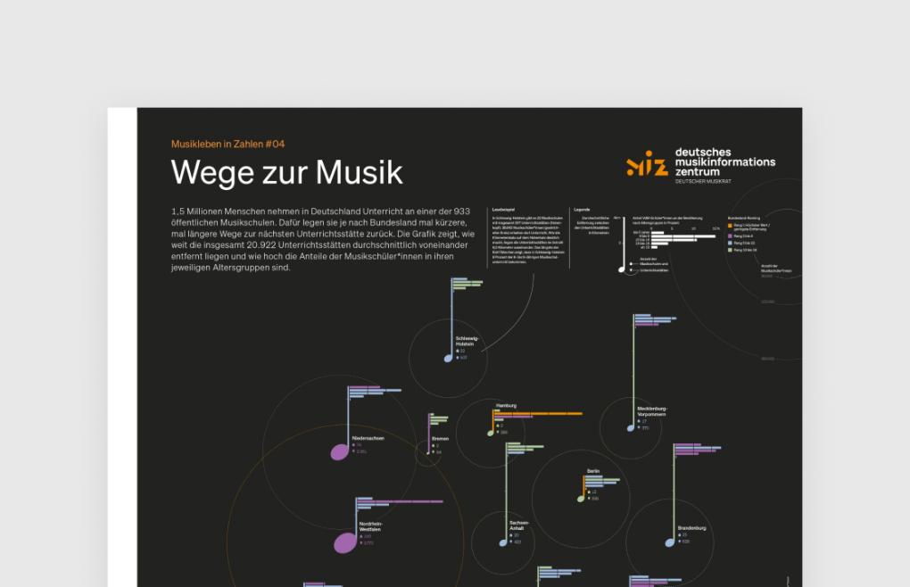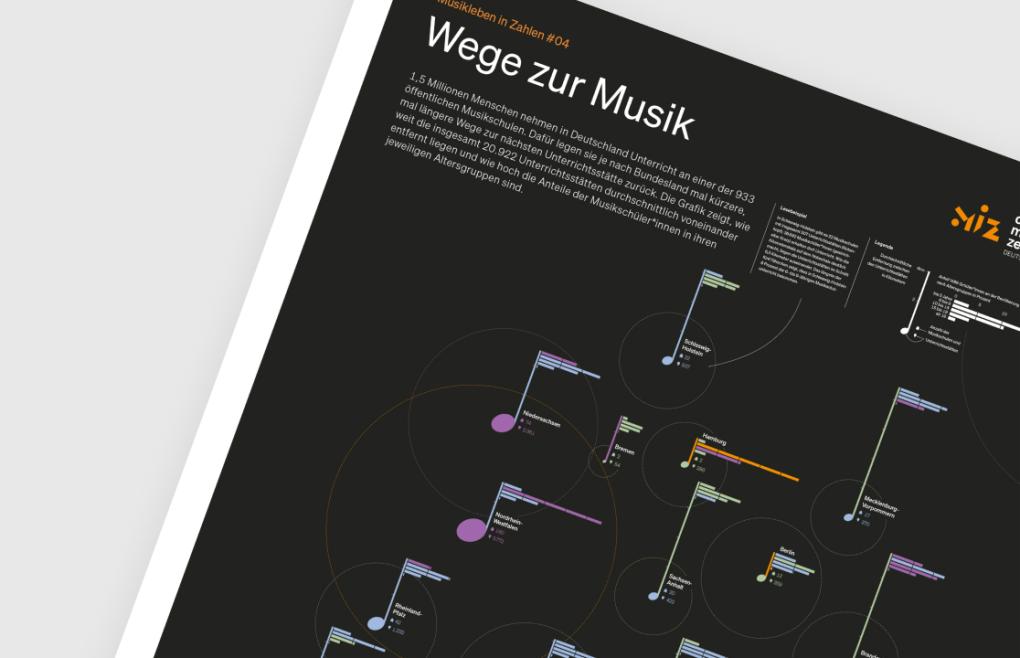 Das Infografikposter „Wege zur Musik“ zeigt, wie sich die Musikschüler:innen auf die 16 Bundesländer verteilen und wie hoch ihr Anteil in verschiedenen Altersgruppen der Bevölkerung ist. Außerdem steht die Infrastruktur der Musikschulen im Fokus: Wie weit liegen die Unterrichtsstätten auseinander? Wie unterscheidet sich die Musikschullandschaft in Regionen mit dichter, mittlerer und niedriger Bevölkerungsdichte?